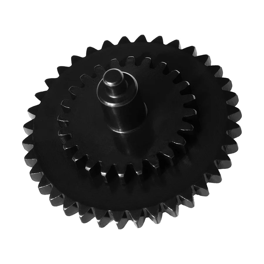 Bevel Gear consists of a bevel gear plate and a gear shaft made of MIM technology. Both sides of the bevel gear part and the inner hole have been precision machined to reduce the swing caused by the low precision of the MIM process. The gear shaft is produced using CNC turning, CNC gear hobbing, and straight grain rolling processes. The heat treatment process of the bevel gear and gear shaft is hardened to HRC42-47 and HRC39-42 respectively. The teeth of the gear shaft are relatively thin. In order to avoid brittle fracture, the hardness is slightly reduced to obtain better toughness. In addition, we also specially customized the tool parameters for the gear shaft to try to increase the width of the teeth and try to improve the toughness. A balance between boosting and keeping noise low.