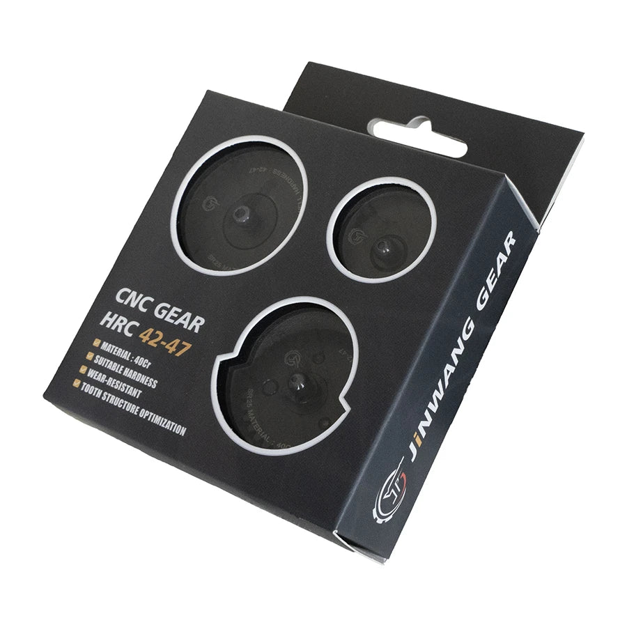 The whole spur gear is made of 40Cr material, through CNC turning, CNC hobbing, heat treatment, polishing and blackening process. Gear using turning and milling composite machine integrated processing molding, making the gear more precise, less swing, high-speed operation, less noise, while the gear hardness HRC42-47, the previous version of HRC33-38, hardness and toughness of all together. The blackening process we use makes the thickness of the surface covering layer almost non-existent, which is also one of the reasons why there is no dryness between the gear meshing.